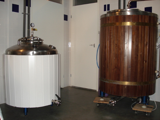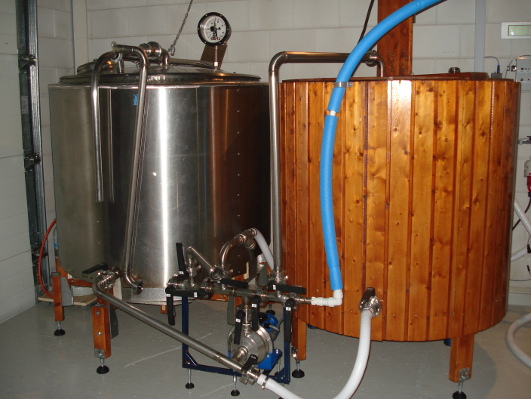 DecoctieDe brouwinstallatie werkt volgens het zogenaamde decoctiesysteem. Bent u een hobbybrouwer of weet u iets van brouwen af, dan zal u dit waarschijnlijk verbazen. Het decoctiesysteem is een eeuwenoude methode en volgens sommigen achterhaald. Maar er zijn ook brouwerijen die erbij zweren en beweren dat het decoctiesysteem een onnavolgbaar karakter aan het bier geeft. Het haalt meer smaak uit de mout dan welke andere moderne brouwmethode, met name in direct gestookte ketels, zoals deze. Een enkele brouwerij in Duitsland gebruikt het nog (in bijvoorbeeld Beieren en Düsseldorf) of Amerika (Boston) waar uitgesproken moutige bieren gemaakt worden.De brouwketel is tevens decoctieketel, de beslagkuip is tevens filterkuip. Het decoctieproces wordt vervolgens uitgevoerd door een zelf ontworpen installatie. "If you have the philosophy of using decoction, you will hardly go away from it" Juergen Buhrmann, technisch manager mouterij Weyermann, Bamberg, Duitsland.